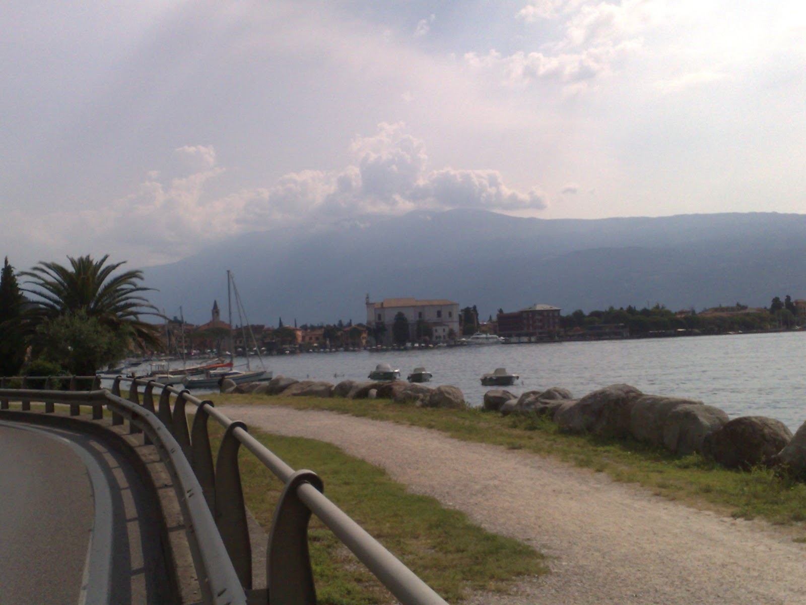 a Salò alle 9.30 ne approfitto per comprarmi dei panini imbottiti e faccio una seconda colazione sul lungolago con pizza e cocacola. Fino ad ora ho pedalato al fresco del mattino anche col sole ma all'orizzonte cominciano a vedersi i primi nuvoloni minacciosi.